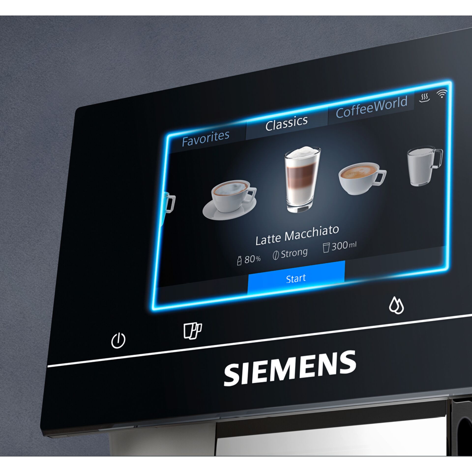 Mit dem Siemens Kaffeevollautomat EQ700 steht dir die ganze Welt des Kaffeegenuss offen: Entdecke eine große Auswahl an internationalen Kaffeespezialitäten mit einem Wisch auf dem Display - der Siemens coffeeWorld. Wie magst du deinen Kaffee am liebsten? Mild, ausgewogen oder markant? Mit aromaSelect nimmst du individuelle Einstellungen ganz nach deinem Geschmack vor. Funktion und Ästhetik findest du im Siemens Kaffeevollautomat EQ700 perfekt vereint. Internationale Kaffeespezialitäten, ein intuitives Full-Touch-Display und ein beleuchteter Kaffeeauslauf.